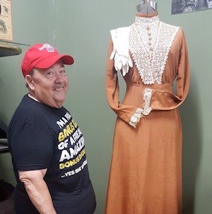 So when Millard Carnes and his wife Jan, from Plattsmouth, NE, stopped in to see the museum last Tuesday, we were delighted to hear that his grandmother's wedding dress was in the Peterson Clothing store on our boardwalk.